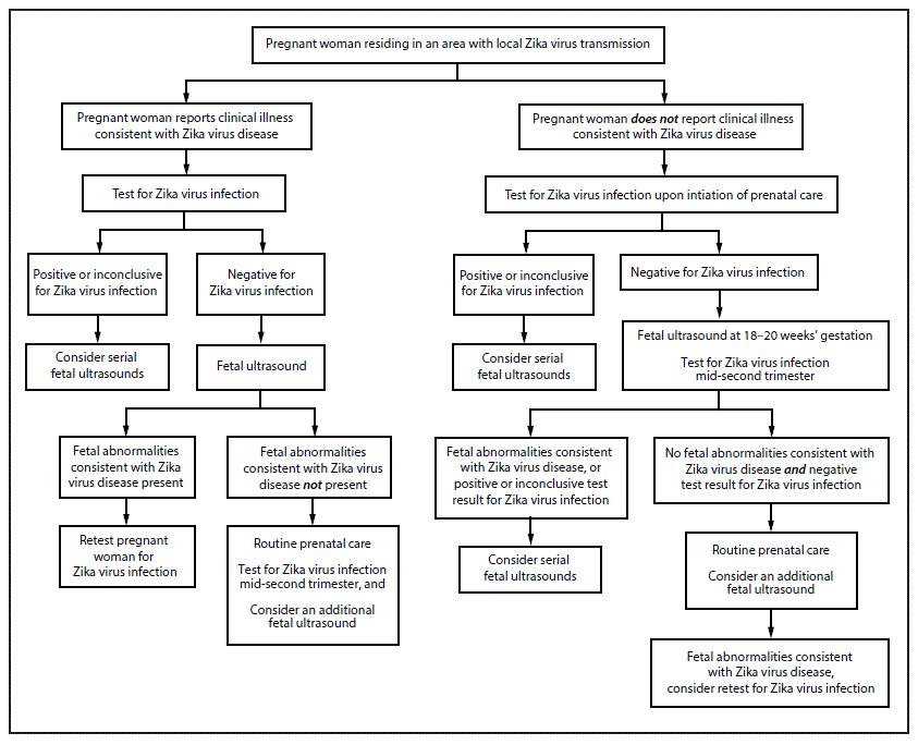 Health care providers should assess their patients’ travel histories. In certain circumstances, such as patients with frequent travel (e.g., daily or weekly) to areas of active Zika virus transmission, health care providers should follow CDC’s interim guidance for pregnant women residing in areas with active Zika virus transmission (Figure 2). Health care providers who care for pregnant women who reside along the U.S.-Mexico border should assess their patients’ travel histories, including frequency of cross-border travel, and destinations. Areas of active Zika virus transmission in Mexico not bordering the United States have been reported. There are currently no reports of active Zika virus transmission along the U.S.-Mexico border. However, if active transmission occurs, local health officials should determine when to implement testing of asymptomatic pregnant women based on information about levels of Zika virus transmission and laboratory capacity.