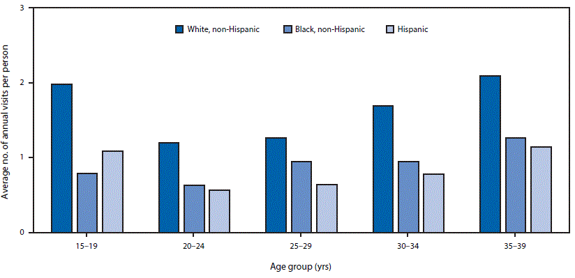 During 2009–2012, males aged 15–39 years made an average of 1.4 visits per year to physicians’ offices. Visits by white males (1.6 visits per person) were more frequent than visits by black males (0.9) and Hispanic males (0.8) (Table 1). Among all racial/ethnic groups, visits per person per year by males aged 15–19 years, 20–24 years, and 35–39 years were 1.6, 1.0, and 1.8, respectively (Table 1). The number of annual visits per persons was lower for all age groups among black and Hispanic males compared with white males (Figure).