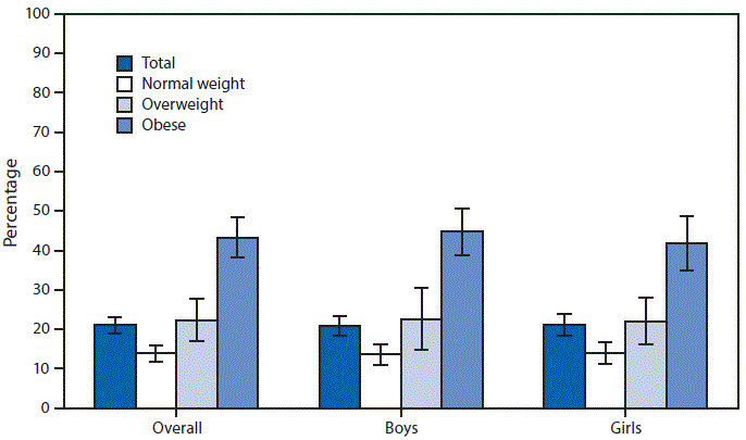 § Calculated as body mass index (BMI) rounded to one decimal place; BMI = weight (kg)/height (m2). The age-and sex-specific percentiles of the 2000 CDC growth charts were used to categorize BMI percentiles as follows: normal weight = ≥5th percentile to <85th percentile; overweight = ≥85th percentile to <95th percentile; and obese = ≥95th percentile. During 2011–2014, 61.3% of young persons aged 6–19 years were normal weight, 15.7% were overweight, and 19.3% were obese.