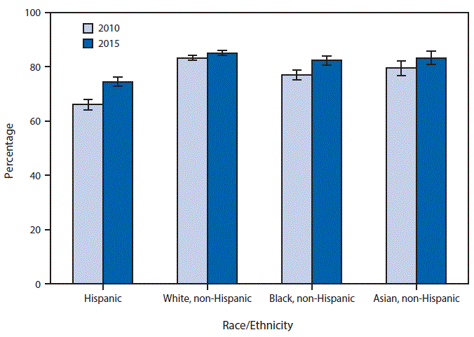 From 2010 to 2015, there was an increase in the percentage of Hispanic adults (66.1% to 74.5%), non-Hispanic white adults (83.3% to 85.1%), non-Hispanic black adults (77.1% to 82.4%), and non-Hispanic Asian adults (79.5% to 83.3%) aged 18–64 years who had a usual place to go for medical care. In 2010, non-Hispanic white adults aged 18–64 years were the most likely to have usual place to go for medical care, but there was no significant difference between non-Hispanic white and non-Hispanic Asian adults in 2015. In both 2010 and 2015, Hispanic adults aged 18–64 years were the least likely to have a usual place to go for medical care.