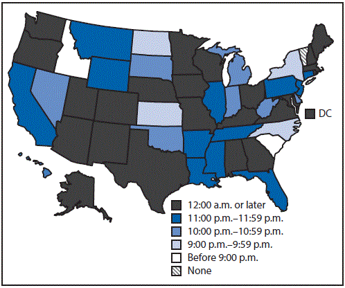FIGURE. Graduated driver licensing night driving restriction starting hours* — United States,† 2016