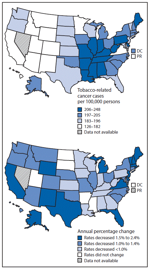 • Tobacco-related cancer incidence rates decreased significantly in 44 states.