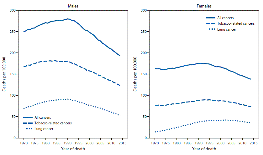Tobacco-related cancer death rates in the United States have been declining since 1990 among men and since 1995 among women and continued to decline through 2014. These declines reflect the implementation of evidence-based tobacco prevention and control interventions, along with improvements in cancer prevention, detection, and treatment (8). Since tobacco-related cancer death rates began to decline, approximately 1.3 million tobacco-related cancer deaths have been averted. However, too many preventable tobacco-related cancer cases and deaths still are occurring. This analysis found that during 2009–2013, cigarette smoking caused 167,000 cancer deaths each year, about 30% of the 577,000 cancer deaths each year (6). Most of these deaths were from lung cancer, the leading cause of cancer deaths for both men and women (6). Furthermore, exposure to secondhand smoke could account for an additional 7,300 lung cancer deaths among nonsmokers (1).