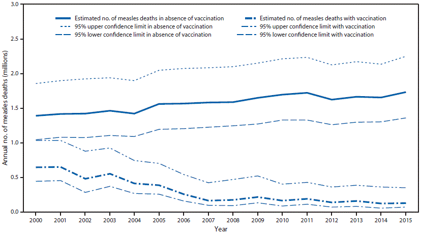 * Compared with no measles vaccination, measles vaccination prevented an estimated cumulative total of 20.3 million deaths during 2000–2015.
