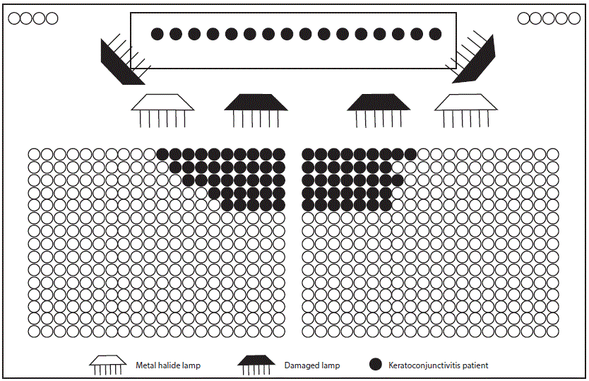 Among the 750 attendees, 92 (12%) met the case definition for keratoconjunctivitis, including all 16 delegates on the speakers’ platform and 76 of 180 (42%) persons sitting in the first five rows (approximately 4–8 meters [approximately 13–26 feet] from the lights); none of the 554 persons sitting in the middle or back rows (>10 meters [>33 feet] from the lights), or standing on either side of the speakers’ platform developed symptoms (Figure). Attack rates among various groups were compared using a chi-square test, with the results expressed as p values.