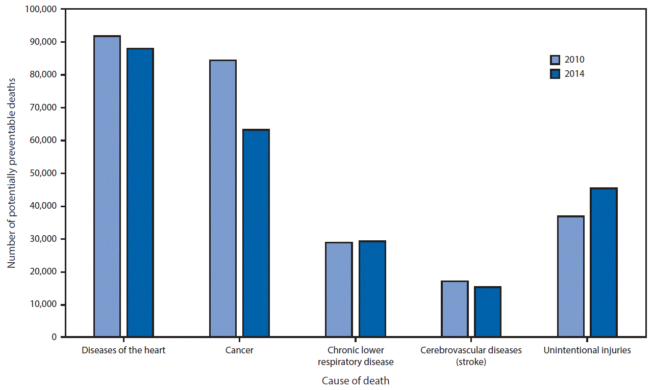 Death rates by specific causes vary across the 50 states and the District of Columbia.* Information on differences in rates for the leading causes of death among states might help state health officials determine prevention goals, priorities, and strategies. CDC analyzed National Vital Statistics System data to provide national and state-specific estimates of potentially preventable deaths among the five leading causes of death in 2014 and compared these estimates with estimates previously published for 2010. Compared with 2010, the estimated number of potentially preventable deaths changed (supplemental material at https://stacks.cdc.gov/view/cdc/42472); cancer deaths decreased 25% (from 84,443 to 63,209), stroke deaths decreased 11% (from 16,973 to 15,175), heart disease deaths decreased 4% (from 91,757 to 87,950), chronic lower respiratory disease (CLRD) (e.g., asthma, bronchitis, and emphysema) deaths increased 1% (from 28,831 to 29,232), and deaths from unintentional injuries increased 23% (from 36,836 to 45,331). A better understanding of progress made in reducing potentially preventable deaths in the United States might inform state and regional efforts targeting the prevention of premature deaths from the five leading causes in the United States.