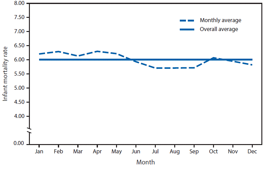 During 2010–2014, the infant mortality rate averaged approximately 6.00 infant deaths per 1,000 live births each month. The infant mortality rate peaked in February and April at approximately 6.30 and was lowest from July to September with approximately 5.71 infant deaths per 1,000 live births.