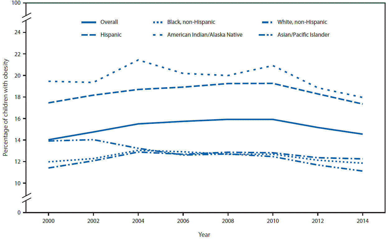 Obesity prevalence in all years was highest among American Indians/Alaska Natives and Hispanics. Among non-Hispanic whites, non-Hispanic blacks, Hispanics, and American Indians/Alaska Natives, prevalence increased significantly during 2000–2004, then decreased significantly during 2010–2014. Among Asians/Pacific Islanders, prevalence decreased significantly throughout the study period (Figure). Patterns in obesity trends remained the same for all racial/ethnic groups if Hawaii and the Northern Mariana Islands were excluded.