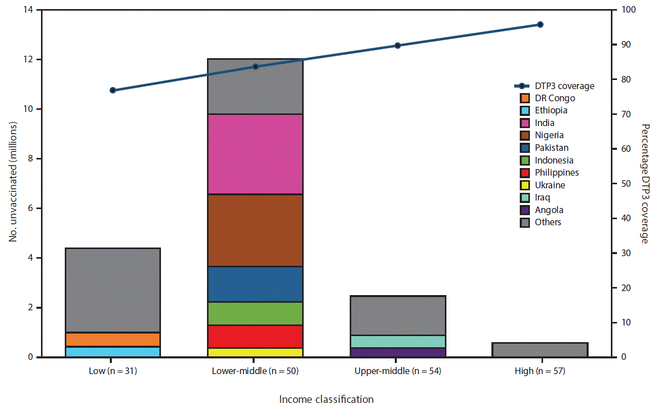 Return to your place in the textFIGURE. Average 3-dose diphtheria-tetanus-pertussis vaccine (DTP3) coverage and estimated number of incompletely vaccinated children, by country income category* — 10 countries and worldwide, 2015