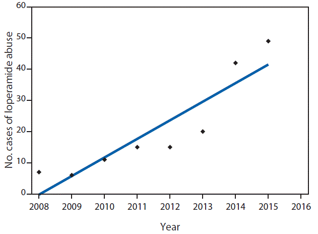 View suggested citationLoperamide is an over-the-counter antidiarrheal with opioid-receptor agonist properties. Recommended over-the-counter doses (range = 2–8 mg daily) do not produce opioid effects in the central nervous system because of poor oral bioavailability and P-glycoprotein efflux* of the medication (1); recent reports suggest that large doses (50–300 mg) of loperamide produce euphoria, central nervous system depression, and cardiotoxicity (2–4). Abuse of loperamide for its euphoric effect or for self-treatment of opioid withdrawal is increasing (5). Cases of loperamide abuse reported to the Upstate New York Poison Center and New York City Poison Control Center were analyzed for demographic, exposure, clinical, and laboratory characteristics. Cases of intentional loperamide abuse reported to the National Poison Database System (NPDS) also were analyzed for demographic, dose, formulation, and outcome information.