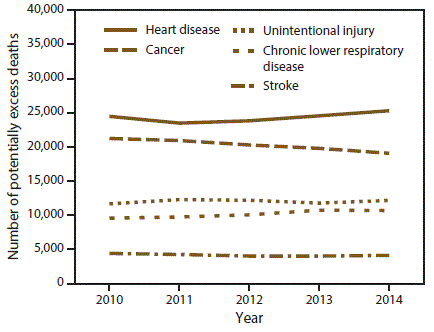Both in nonmetropolitan and metropolitan areas, the five leading causes of death in the United States during 1999–2014 were heart disease, cancer, unintentional injury, chronic lower respiratory disease, and stroke (6) which together accounted for 1,622,304 deaths (approximately 62% of all deaths) in 2014 (6). Four of the five leading causes of death were chronic diseases, two of which (heart disease and cancer) accounted for approximately 46% of all deaths each year (6). Potentially excess deaths (also described as potentially preventable deaths) (7,8) are defined as deaths among persons aged <80 years in excess of the number that would be expected if the death rates for each cause were equivalent across all states to those that occurred among the three states with the lowest rates. Not all potentially excess deaths can be prevented; some areas might have characteristics that predispose residents to higher rates of death, such as long travel distances to specialty and emergency care or exposures to specific environmental hazards. However, many potentially excess deaths might represent deaths that could be prevented through improved public health programs that support healthier behaviors and neighborhoods or better access to health care services.