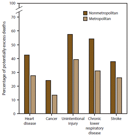 Previous research has shown that residents of nonmetropolitan areas, compared with residents of metropolitan areas, report poorer physical and mental health and have higher rates of health risk factors for the leading causes of death, including factors such as cigarette smoking, obesity, physical inactivity during leisure time, and not wearing car seat belts (2,3,14). They tend to have less access to health care services and to be less likely to receive preventive services (5). In addition, they are more likely to be uninsured or underinsured, delay seeking care, live in poverty, and have lower educational attainment (1,5). The high percentage of potentially excess deaths reported in nonmetropolitan areas might be related to the poorer health, limited socioeconomic resources, restricted access to high-quality emergency and specialty care such as trauma centers and stroke centers, and reduced emergency medical service capability (15) that exist in many nonmetropolitan communities. Although a greater number of potentially excess deaths occur in metropolitan areas because of the larger populations, these findings suggest that a greater percentage of deaths in nonmetropolitan areas might be potentially excess deaths and thus are relevant for public health prevention efforts focused on rural populations. Ongoing work by CDC to reduce rates of smoking (16) and obesity (17) are particularly important because these risk factors contribute to increased risk for heart disease, stroke, chronic lower respiratory disease, and cancer (18,19). In addition, CDC’s efforts to increase access to preventive services, such as cancer screening (20) and cardiovascular risk reduction (21), address barriers that persons living in nonmetropolitan areas might face.