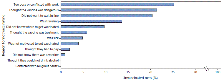 When the 103 (34%) unvaccinated men were asked whether they knew where to get vaccinated, 42% (42) answered no. When answering the open-ended question, the most common reasons reported for nonvaccination were lack of time or vaccination conflicting with working hours (26, 25%); thinking the vaccine was dangerous (22, 21%); and not wanting to wait in line (21, 20%) (Figure).