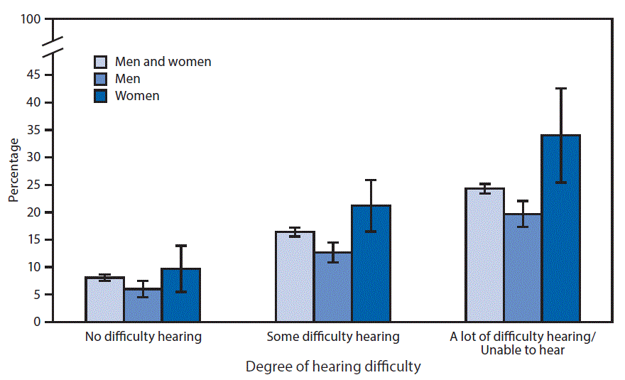 During 2014–2015, adults aged ≥45 years were more likely to find it difficult or be unable to go shopping or go to movies or sporting events as hearing difficulties increased (even with the use of a hearing aid), from 8.1% among those with no difficulty hearing to 16.4% among those with some difficulty hearing, and to 24.3% among those with a lot of difficulty hearing or who were unable to hear. This relationship was found for both men and women. Women were more likely than men to report limitations in these activities at each level of hearing difficulty.