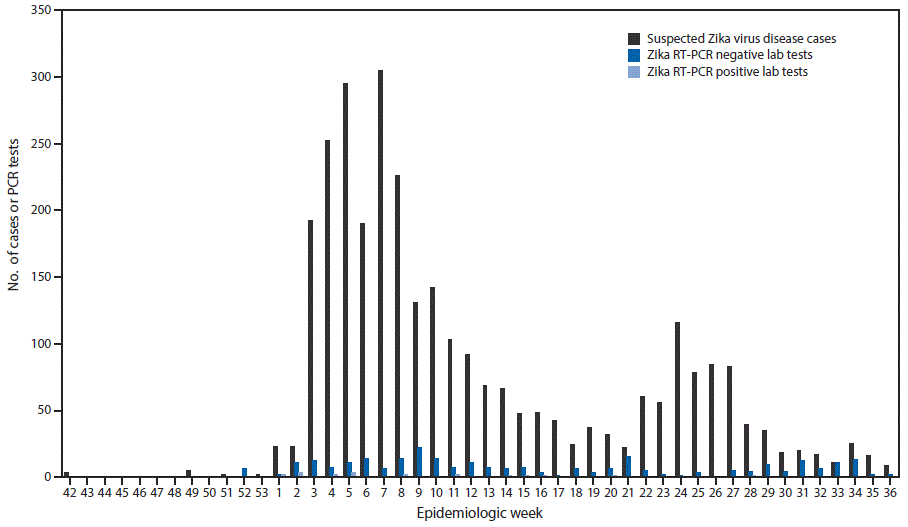 FIGURE. Reported cases of suspected Zika virus disease and RT-PCR testing results*,† by epidemiologic week — Haiti, October 12, 2015–September 10, 2016
