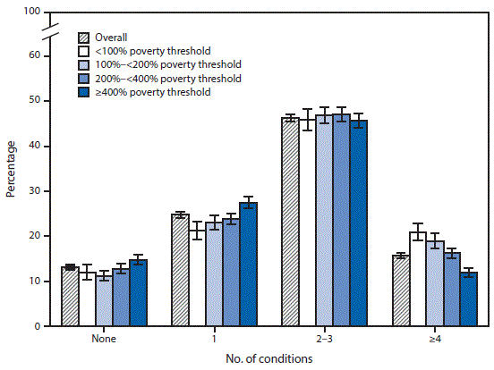 For the period 2013–2015, 13% of adults aged ≥65 years reported having none of 10 selected diagnosed chronic conditions; 25% had one, 46% had two or three, and 16% had four or more of the conditions. No differences by poverty status were observed among those who reported having two or three conditions, but those in the lowest income group (<100% of the poverty threshold) were less likely to have none or only one of the chronic conditions compared with those in the highest income group (≥400% of the poverty threshold). Those in the lowest income group also were more likely to have four or more conditions when compared with those in the highest income group (21% compared with 12%).