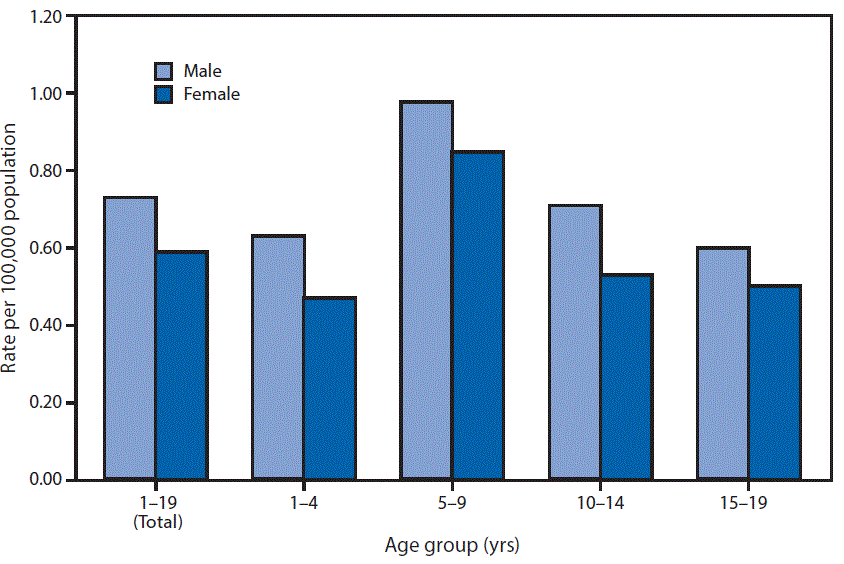 QuickStats: Brain Cancer Death Rates Among Children and Teens Aged 1–19 Years,* by Sex† and Age Group — United States, 2013–2015