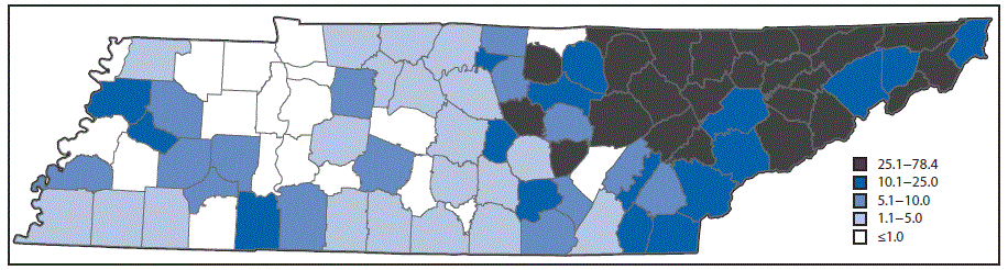 FIGURE 2. Rate of hepatitis C infection among pregnant women per 1,000 live births, by county — Tennessee, 2014