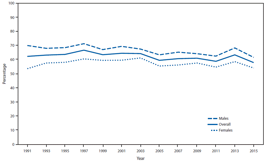 The national YRBS is a cross-sectional, biennial school-based survey of 9th–12th grade students in U.S. public and private schools that monitors the prevalence of health risk behaviors. During 1991–2015, a three-stage cluster sample design was used to select nationally representative samples of students; sample sizes ranged from 10,904 to 16,410. During each cycle, students completed an anonymous, self-administered questionnaire. Response rates ranged from 60% to 71%. Data were weighted to account for oversampling of non-Hispanic black and Hispanic students and nonresponse, and to produce national estimates of health risk behaviors among U.S. high school students who attend public or private schools. Details of the YRBS methodology have been published previously.§§