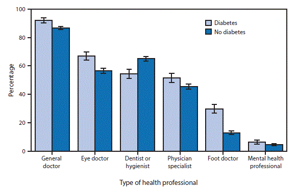 In 2015, adults aged ≥65 years with diagnosed diabetes were more likely than adults without diagnosed diabetes to report seeing general doctors (92.3% compared with 86.7%); eye doctors (66.9% compared with 56.6%); physician specialists (51.5% compared with 45.5%); foot doctors (29.9% compared with 13.0%) and mental health professionals (6.3% compared with 4.5%) in the past 12 months. Those with diabetes were less likely than those without diabetes to report seeing a dentist or dental hygienist in the past 12 months (54.5% compared with 65.0%).