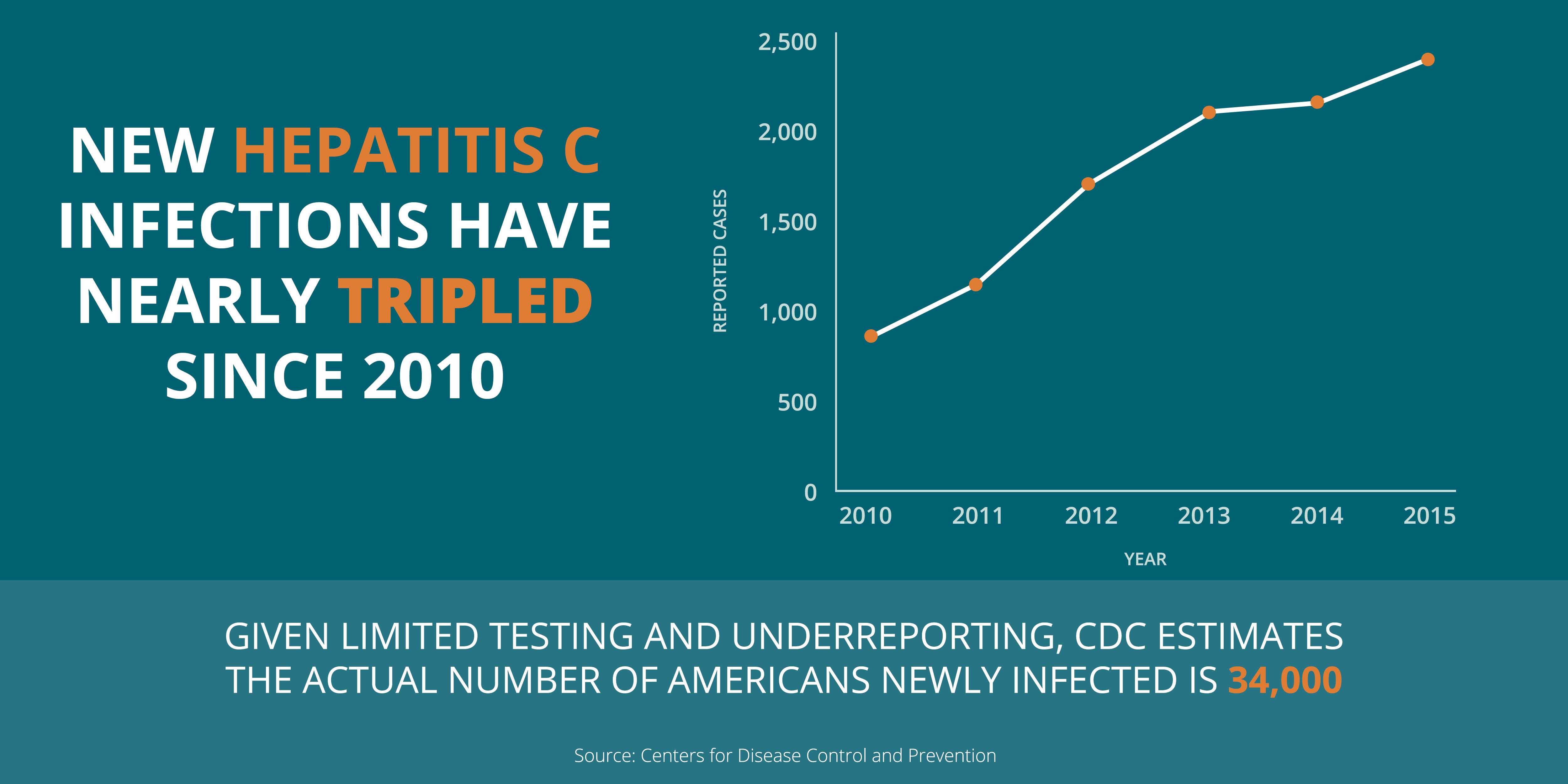 The number of new hepatitis C infections reported to CDC in 2015 was higher than it’s been in 15 years – having nearly tripled since 2010 (850 new cases were reported in 2010, and 2,436 new cases reported in 2015). Because hepatitis C often has few noticeable symptoms, the number of new cases is likely much higher than what is reported. Due to limited testing and underreporting, CDC estimates the actual number of Americans newly infected is 34,000.