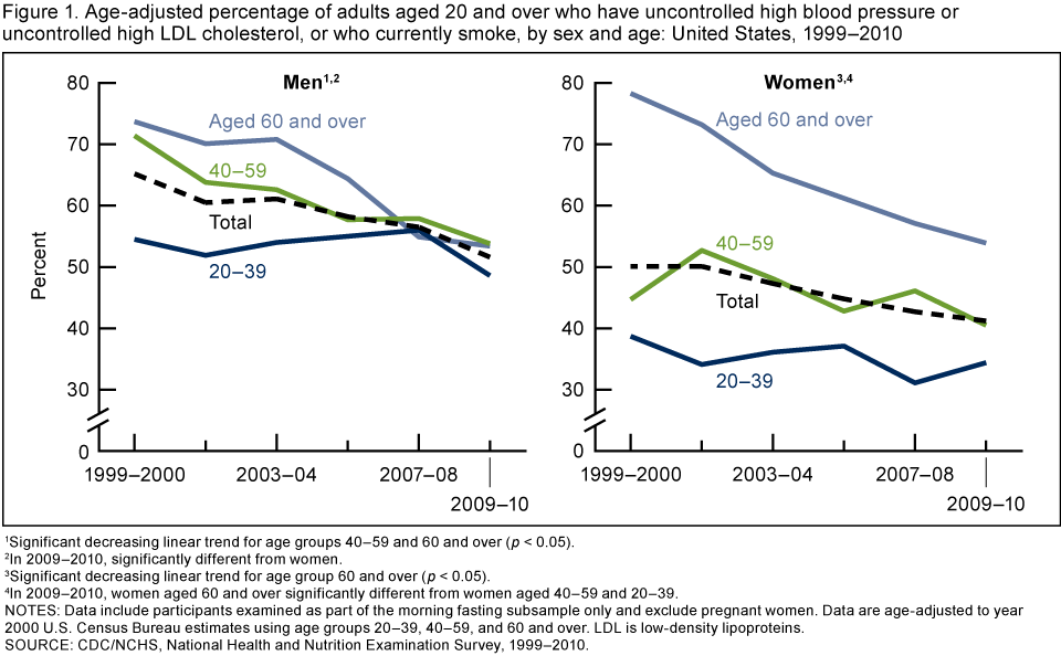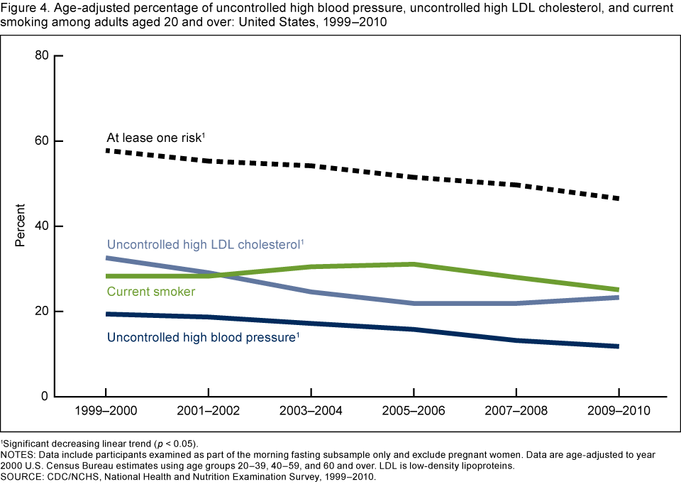 • The prevalence of uncontrolled high blood pressure and of uncontrolled high LDL cholesterol declined between 1999–2000 and 2009–2010, but no significant change occurred in the percentage of adults who smoke cigarettes.