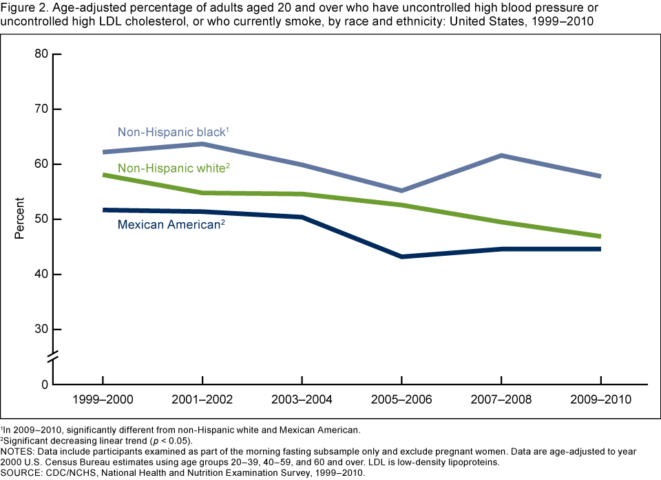 • From 1999–2000 through 2009–2010, a decrease was observed in the percentage of non-Hispanic white and Mexican-American adults who had at least one of the three risk factors for cardiovascular disease. However, this decrease was not found among non-Hispanic black adults.