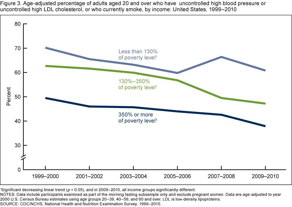 Figure 3. Age-adjusted percentage of adults aged 20 and over who have uncontrolled high blood pressure or uncontrolled high LDL cholesterol, or who currently smoke, by income: United States, 1999–2010