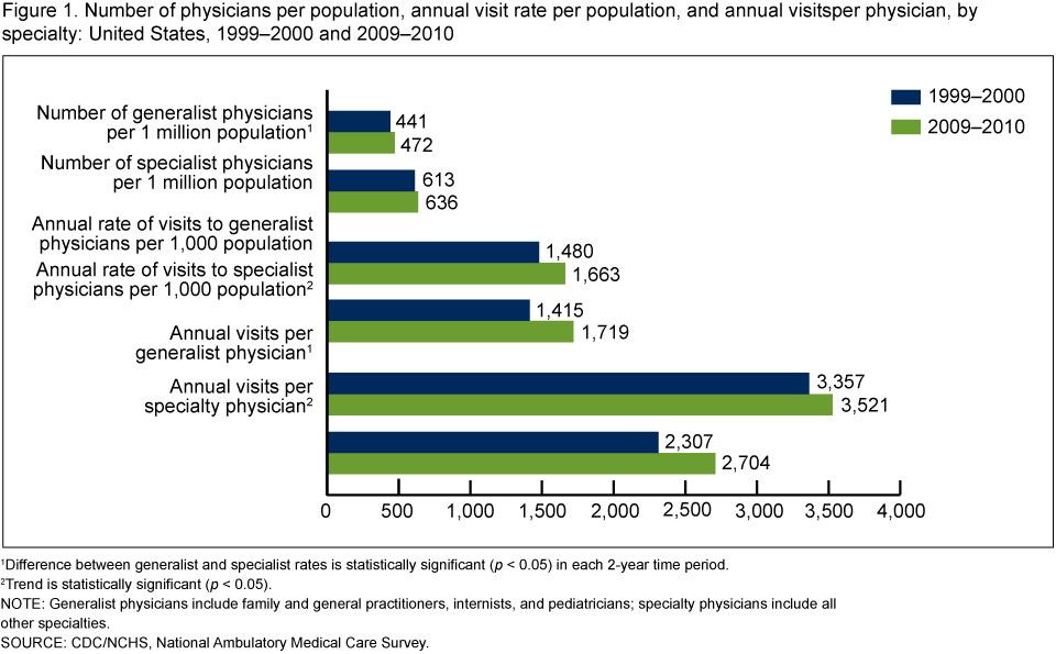 • In 2009–2010, annual visits per generalist physician were 30% higher than visits per specialty physician. A similar pattern was observed in 1999–2000.