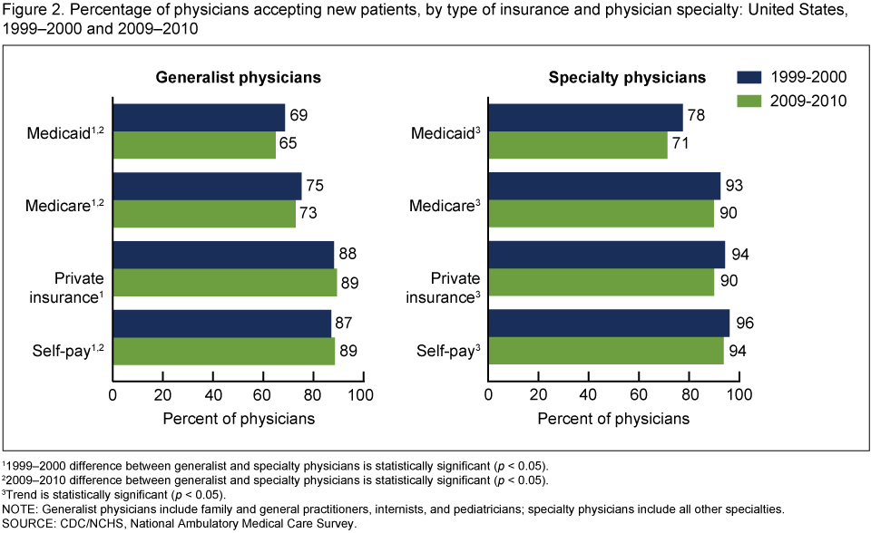 • In both 1999–2000 and 2009–2010, generalist physicians were less likely to accept new Medicare patients and Medicaid patients than were specialty physicians.