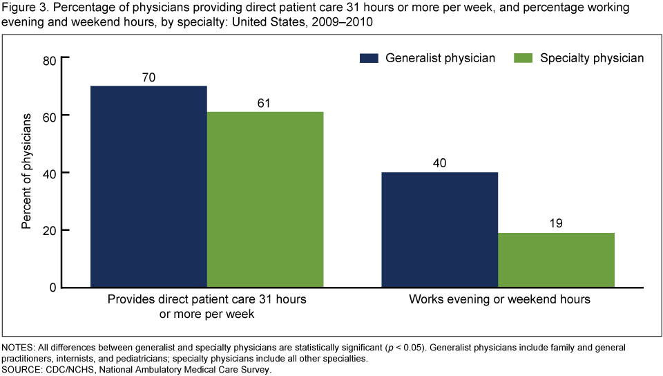 • In 2009–2010, a greater percentage of generalist physicians (40%) worked evening and weekend hours than did specialty physicians (19%).