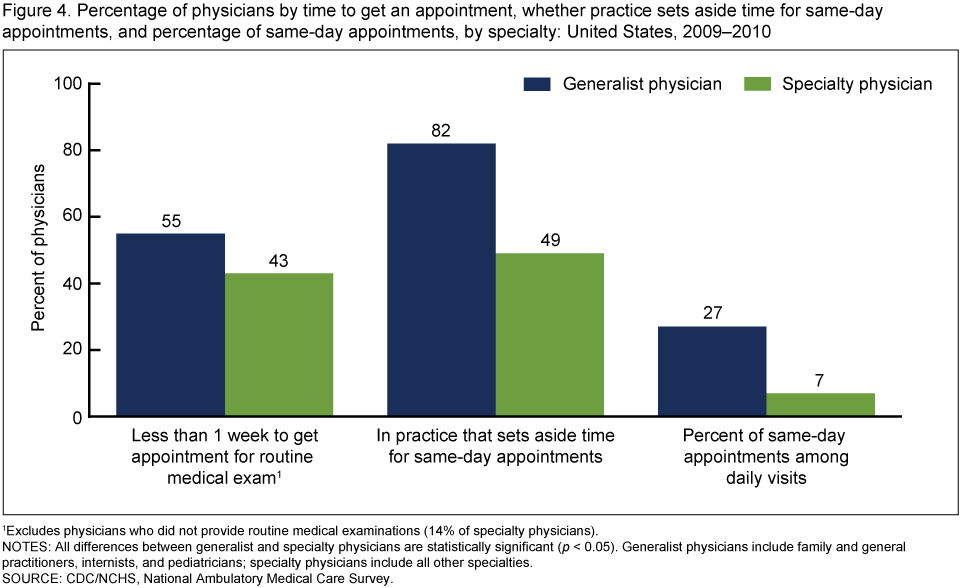 • In 2009–2010, generalist physicians were more likely to set aside time for same-day appointments (82%) than were specialty physicians (49%).