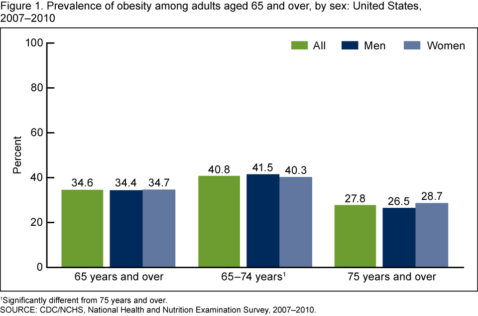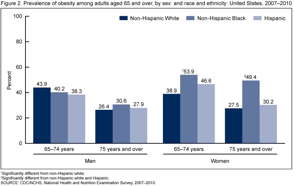 In 2007–2010, more than one-third of older adults were obese, which corresponds to approximately 13 million obese older adults. Obesity prevalence among women aged 65–74 was higher than in women aged 75 and over in all racial and ethnic groups except non-Hispanic black women.