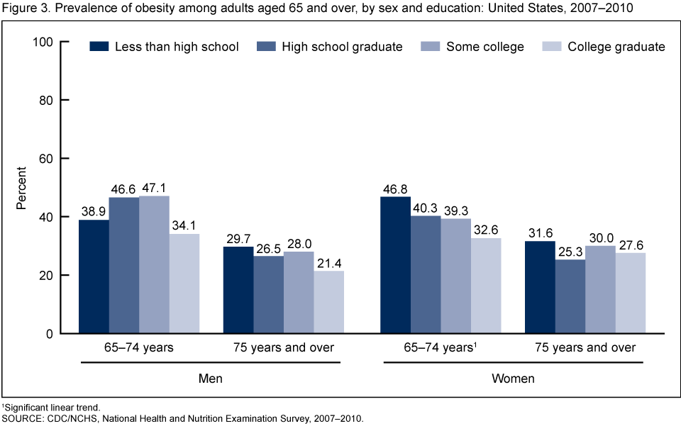 Figure 3. Prevalence of obesity among adults aged 65 and over, by sex and education: United States, 2007–2010