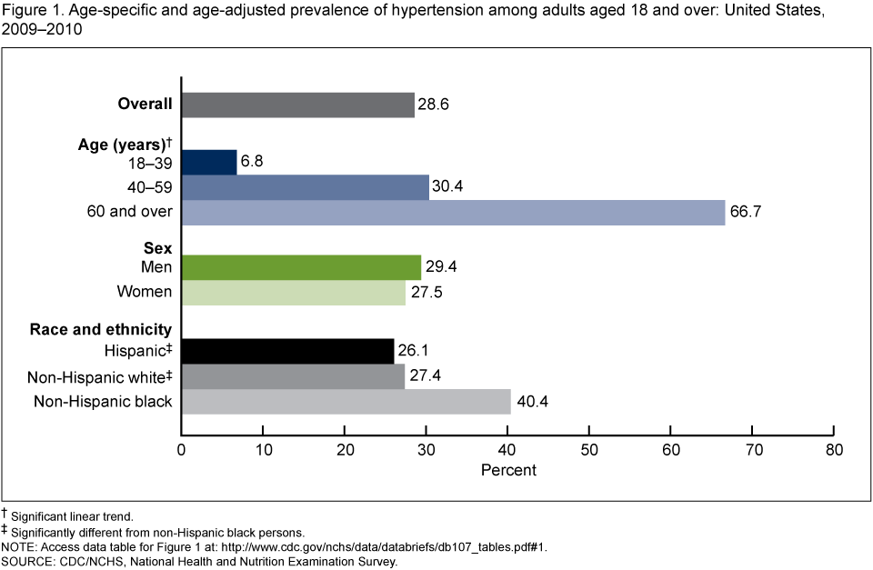 - The age-adjusted prevalence of hypertension among U.S. adults aged 18 and over was 28.6% in 2009–2010 (Figure 1). There was no significant change from 2007–2008.