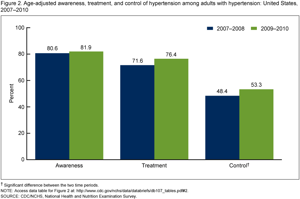 - Among adults with hypertension, the percentage with controlled hypertension increased from 48.4% in 2007–2008 to 53.3% in 2009–2010.