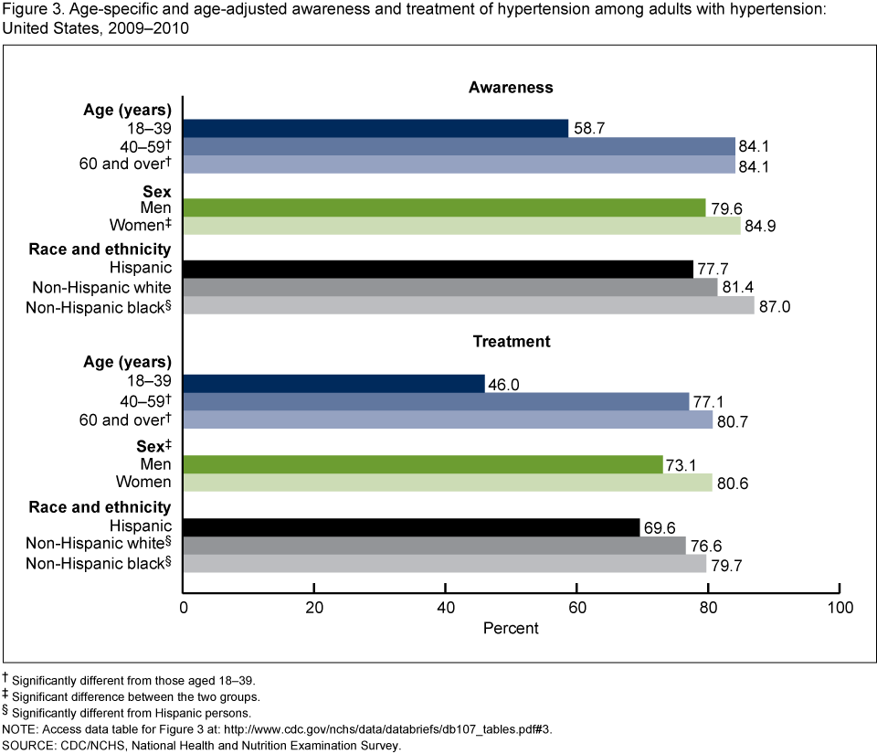 - Among adults with hypertension in 2009–2010, 81.9% were aware of their hypertension.