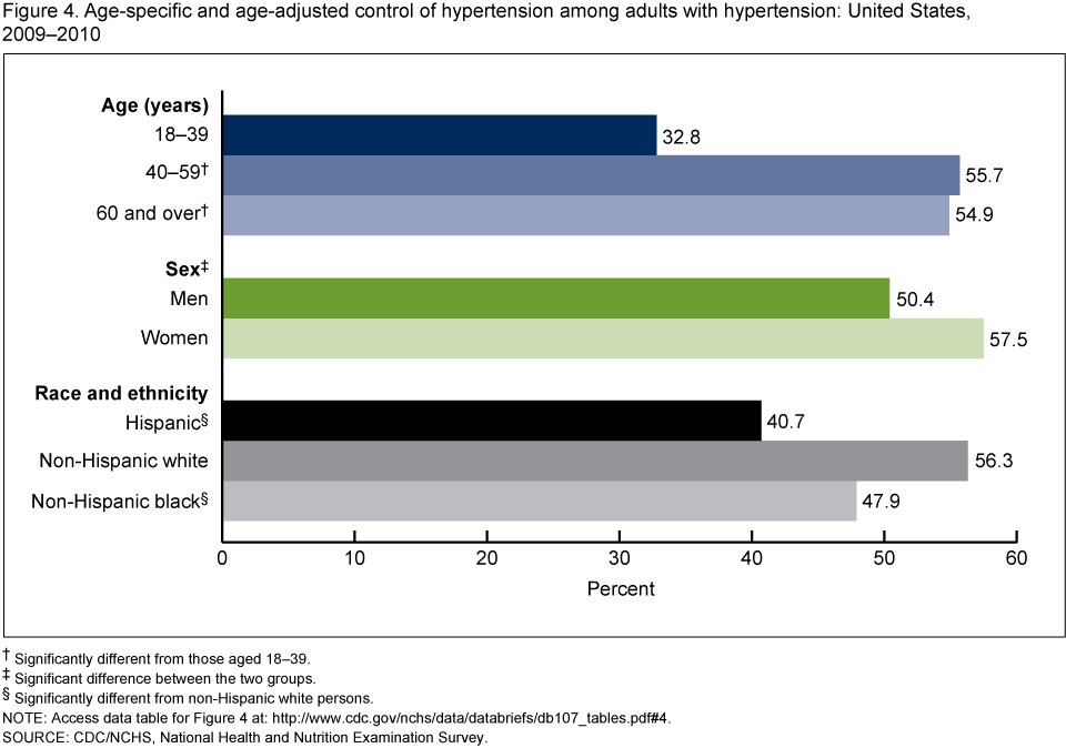 - Age-adjusted control of hypertension was greater among non-Hispanic white adults with hypertension (56.3%) compared with non-Hispanic black adults (47.9%) and Hispanic adults (40.7%) with hypertension.