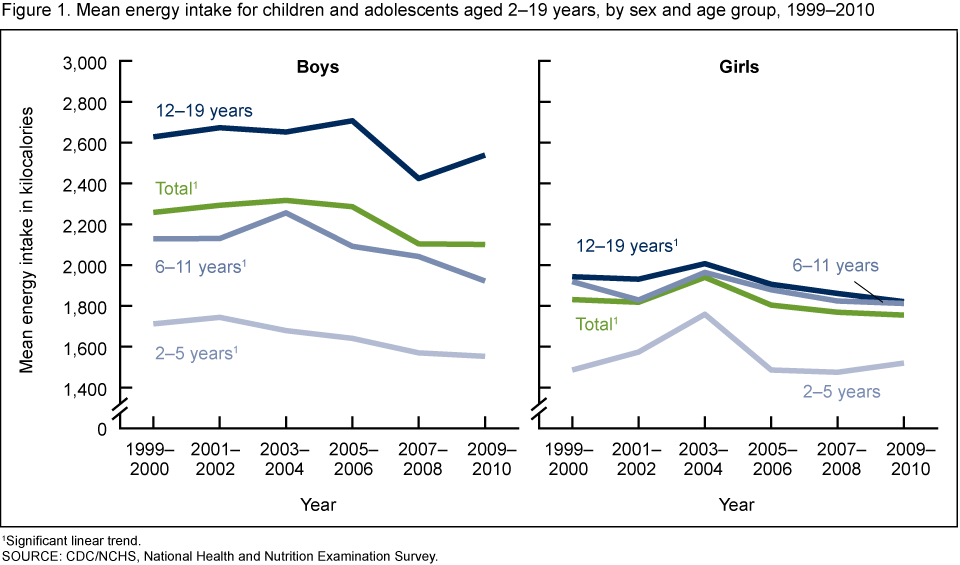 • Average energy intakes for all boys and all girls aged 2–19 decreased over this 12-year period (Figure 1). The average energy intake for boys decreased from 2,258 kilocalories in 1999–2000 to approximately 2,100 kilocalories in 2009–2010. The average energy intake for girls decreased from 1,831 kilocalories in 1999–2000 to 1,755 kilocalories in 2009–2010.