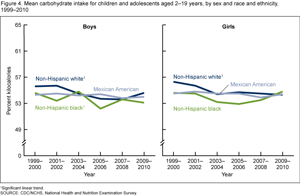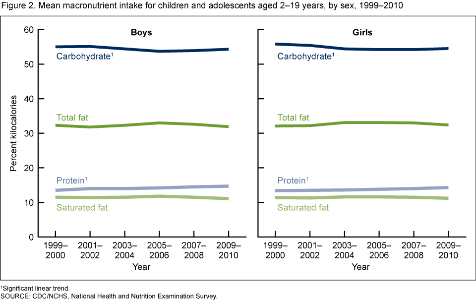 • Among children and adolescents aged 2–19, the percentage of kilocalories from carbohydrate for boys decreased from 55.0% in 1999–2000 to 54.3% in 2009–2010 and for girls from 55.8% in 1999–2000 to 54.5% in 2009–2010.