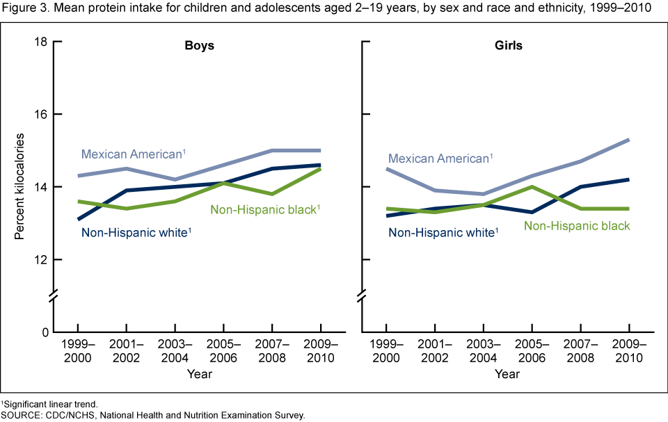 • The percentage of kilocalories from protein for non-Hispanic white and Mexican-American girls increased, whereas the percentage for non-Hispanic black girls aged 2–19 did not. The percentage of kilocalories from protein increased from 13.2% to 14.2% for non-Hispanic white girls and from 14.5% to 15.3% for Mexican-American girls over this time period. Among non-Hispanic black girls, the prevalence remained at about 13.5%.