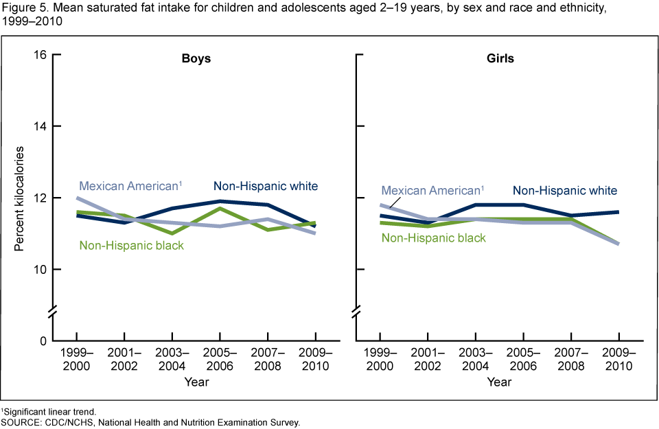 • The percentage of kilocalories from saturated fat decreased for Mexican-American boys and girls aged 2–19. The percentage of kilcalories from saturated fat decreased from 12.0% to 11.0% for Mexican-American boys and from 11.8% to 10.7% for Mexican-American girls (Figure 5).