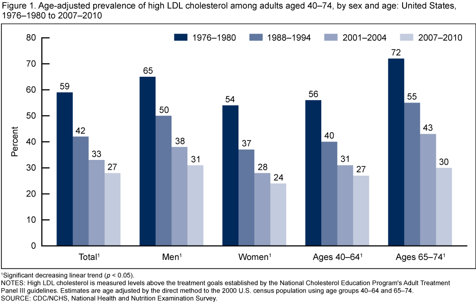 - Between 1976–1980 and 2007–2010, the prevalence of high LDL–C significantly decreased for men (65% to 31%), women (54% to 24%), and adults aged 40–64 (56% to 27%) and 65–74 (72% to 30%) (Figure 1).