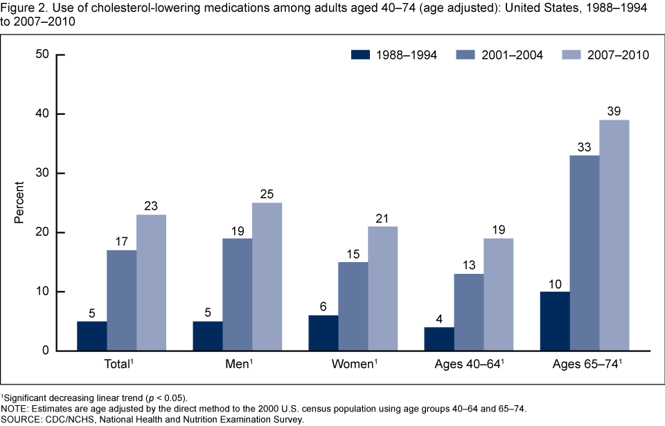 - From 1988–1994 through 2007–2010, the use of cholesterol-lowering medication significantly increased for men (5% to 25%), women (6% to 21%), and adults aged 40–64 (4% to 19%) and 65–74 (10% to 39%).