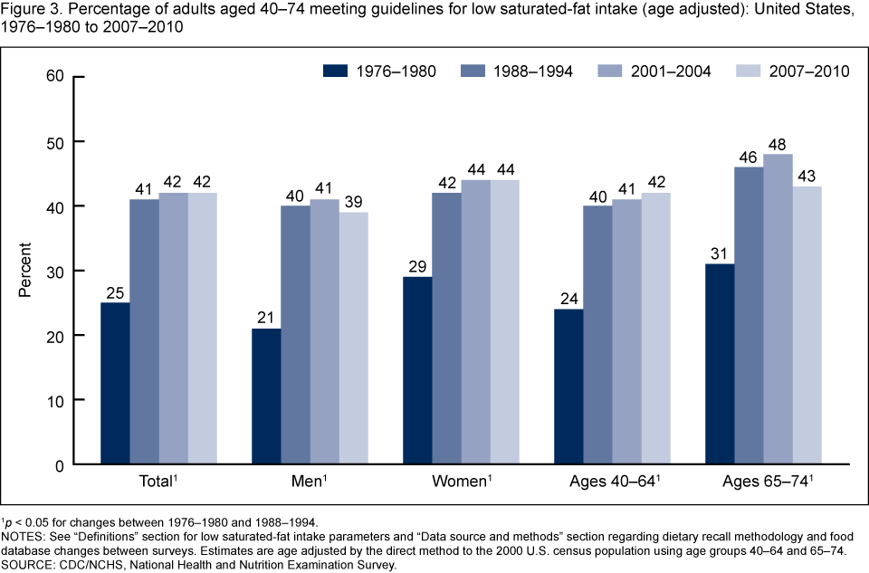 - An increased percentage of adults met guidelines for low saturated-fat intake from 1976–1980 to 1988–1994, but the percentage remained unchanged from 1988–1994 through 2007–2010.
