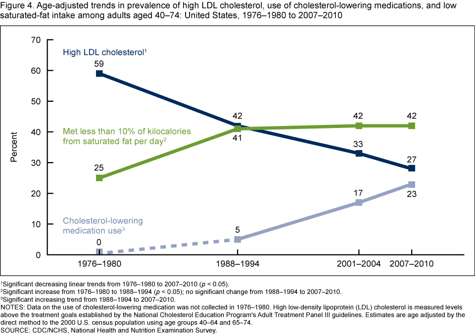 Figure 4. Age-adjusted trends in prevalence of high LDL cholesterol, use of cholesterol-lowering medications, and low saturated-fat intake among adults aged 40–74: United States, 1976–1980 to 2007–2010
