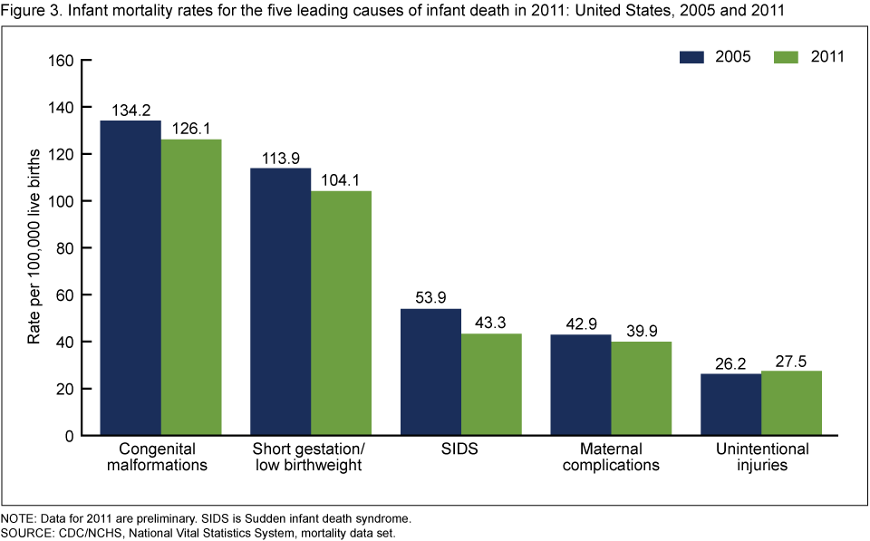 - The infant mortality rate declined for four of the five leading causes of infant death from 2005 through 2011.