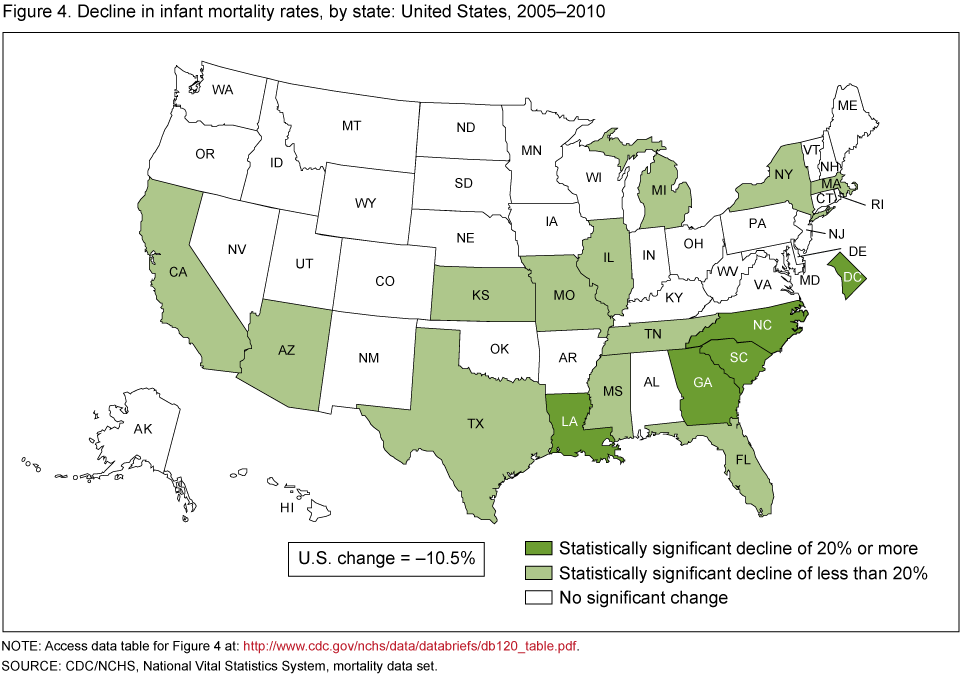 Four states (Georgia, Louisiana, North Carolina, and South Carolina) and the District of Columbia had a decline of 20% or more in their infant mortality rate from 2005 through 2010. These areas have had persistently high infant mortality rates for many years (1,2).