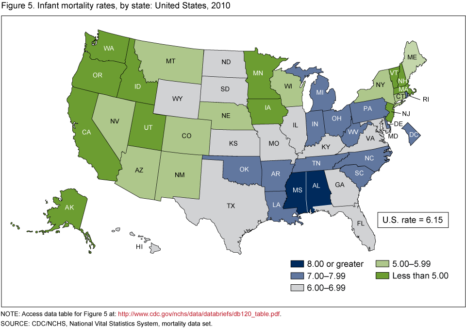 In 2010, 13 states and the District of Columbia had infant mortality rates of 7.00–7.99, and two additional states (Mississippi and Alabama) had infant mortality rates of 8.00 or higher. In contrast, 12 states had infant mortality rates below 5.00 (Figure 5).