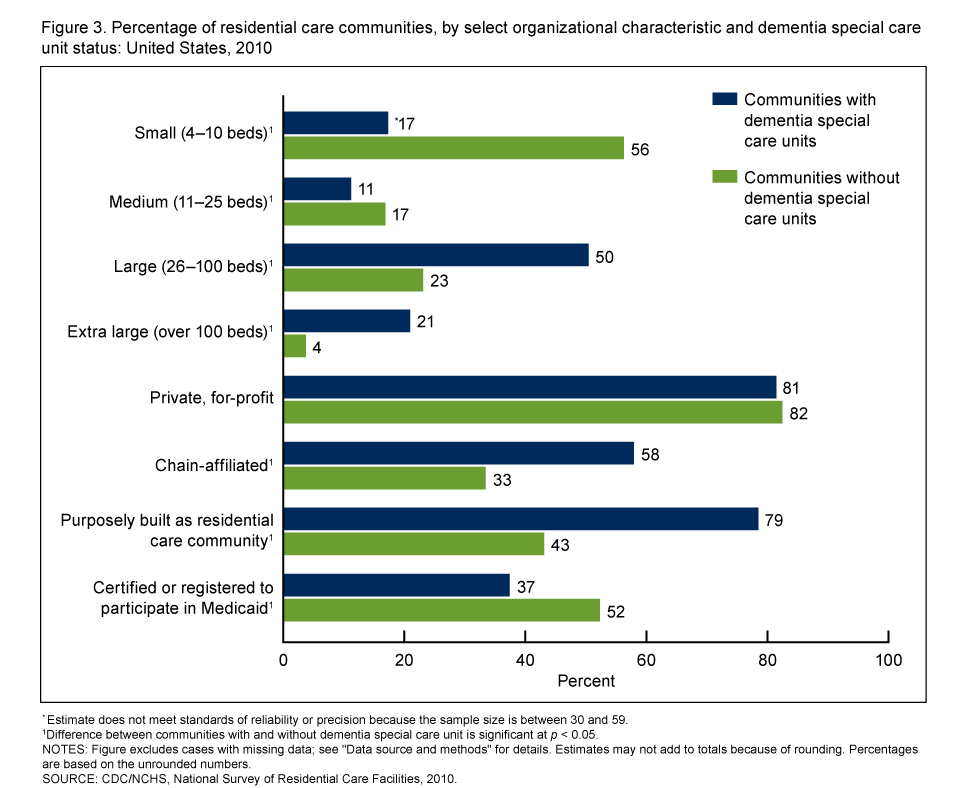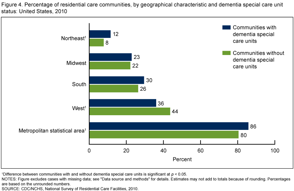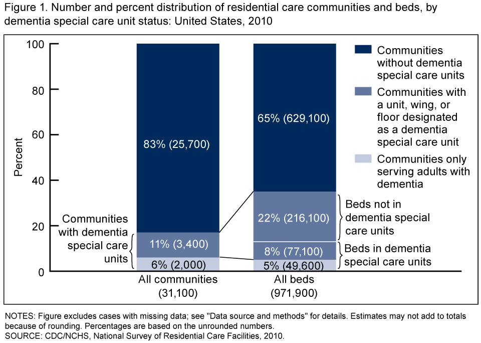 Park-Lee E, Sengupta M, Harris-Kojetin LD. Dementia special care units in residential care communities: United States, 2010. NCHS data brief, no 134. Hyattsville, MD: National Center for Health Statistics. 2013.